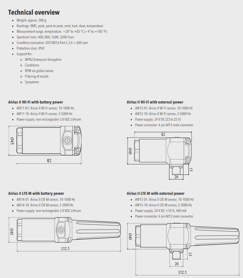 IP69 koruma sınıfına sahip kompakt ve sağlam tasarımıyla Airius, yıllarca sorunsuz kullanım ve istikrarlı izleme sağlar. Pille çalışan versiyon, Wi-Fi versiyonu için günde dört ölçüm ve LTE-M versiyonu için günde iki ölçümle dört yıl dayanan, sahada değiştirilebilir bir lityum-tiyonil pil kullanır. Kablosuz titreşim sensörü, harici güç kaynağına sahip bir versiyonda da sunulmaktadır.